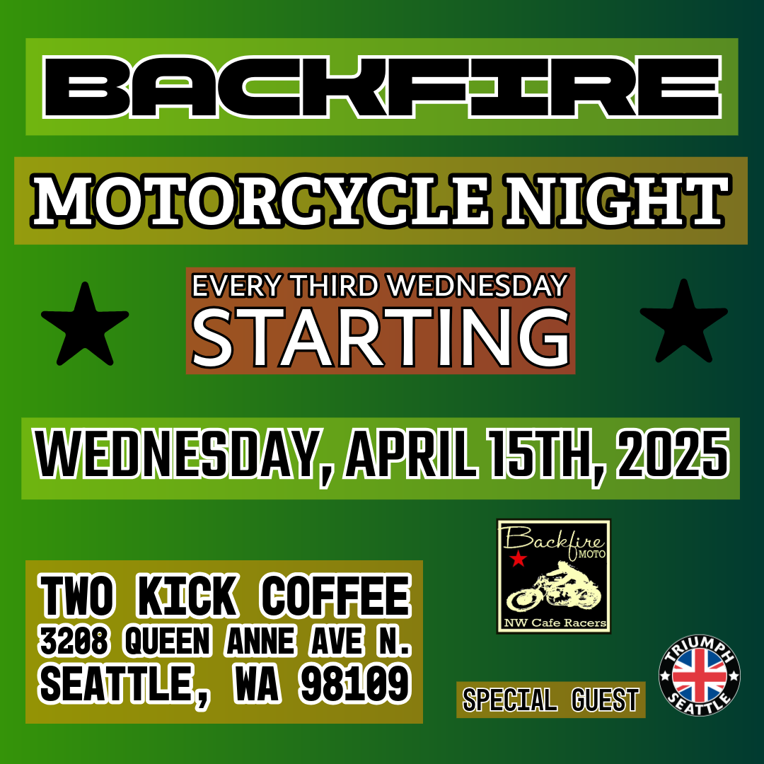 Backfire Motorcycle Night - April Wednesday, April 15, 2026 5:00 PM 9:30 PM 17:00 21:30 Two Kick Coffee 3208 Queen Anne Avenue North Seattle, WA, 98109 United States (map) Google Calendar ICS Every third Wednesday from April through October is Backfire Motorcycle Night at Two Kick Coffee! Check out the details on the Backfire Moto website. (The year shown below is 2025, but this is the 2026 poster - someone needs their coffee.)